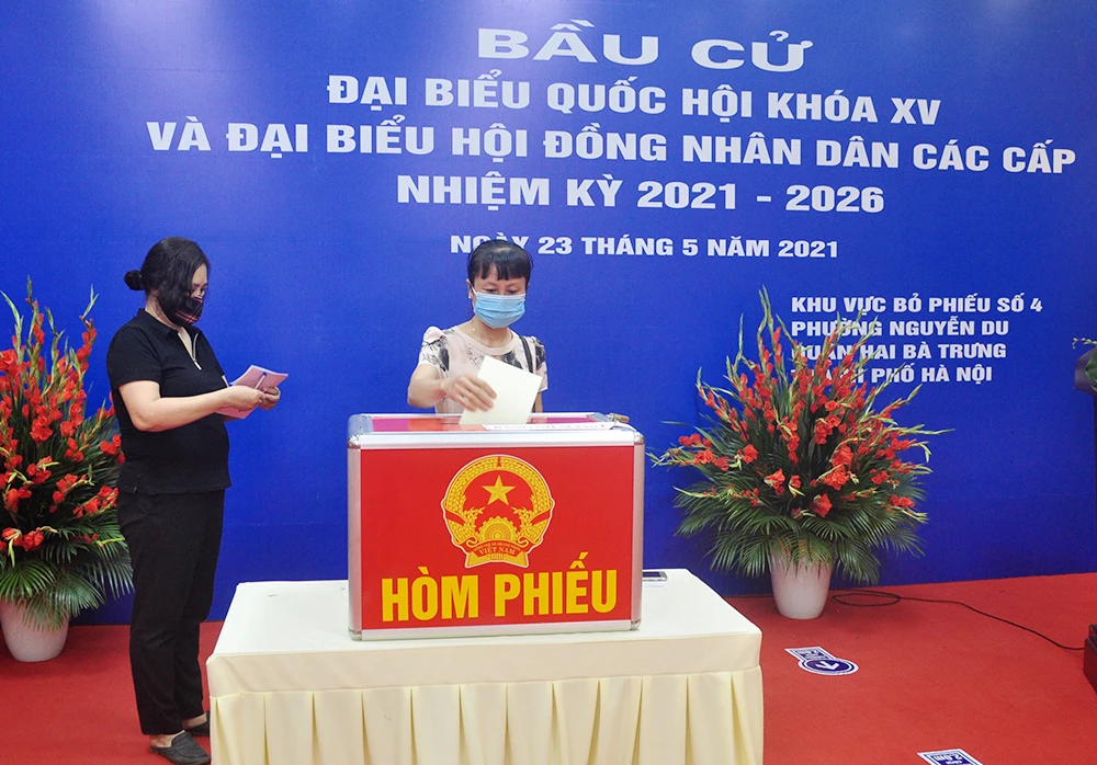 Các cử tri đi bầu cử tại khu vực bỏ phiếu số 4, phường Nguyễn Du (Hai Bà Trưng, Hà Nội) ngày 23-5. Ảnh: TP
