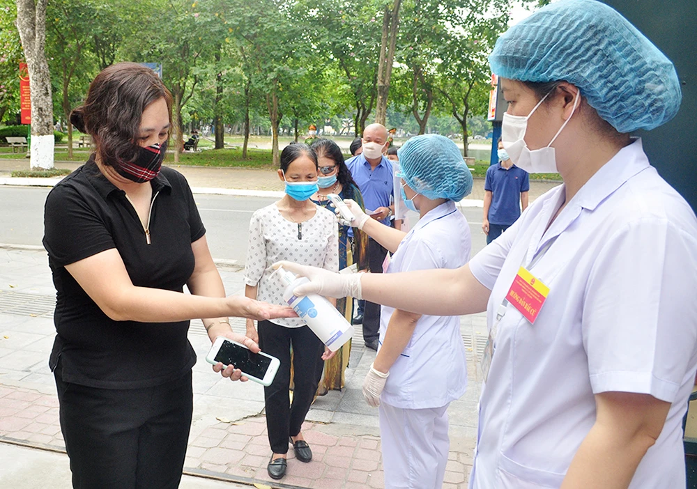 Nhân viên y tế hướng dẫn cử tri thực hiện các biện pháp phòng chống dịch tại khu vực bỏ phiếu số 4, phường Nguyễn Du, quận Hai Bà Trưng. Ảnh: TP
