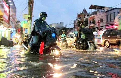 Còn tại TP.HCM chiều cùng ngày, mưa lớn đã khiến nhiều tuyến đường tái diễn cảnh ngập nặng. Ghi nhận tại ngã tư Bạch Đằng giao Đinh Bộ Lĩnh (quận Bình Thạnh), nước đã ngập sâu 40-50 cm. Hiện tượng ngập nước đã khiến giao thông trên một số tuyến đường như Xô Viết Nghệ Tĩnh, Ung Văn Khiêm, Nguyễn Hữu Cảnh bị ùn tắc. Khu vực gần Bến xe Miền Đông xe cộ bị dồn ứ hàng trăm mét.