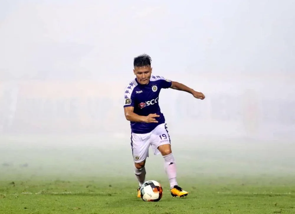 Quang Hải đi bóng trong làn khói mờ, hậu quả của những quả pháo sáng. ẢNH: GOAL