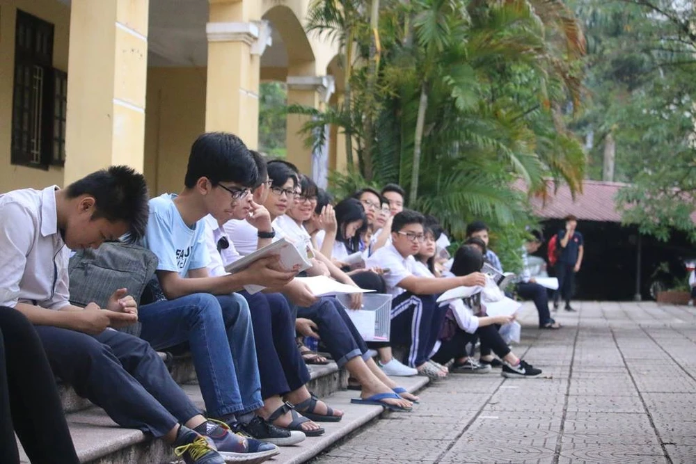 Nhiều thí sinh tranh thủ ôn bài trước khi bước vào phòng thi.