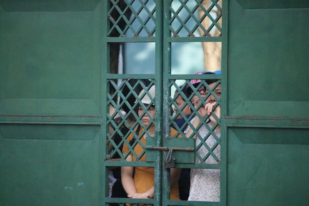 Cảnh phụ huynh dõi theo con ở cổng trường.