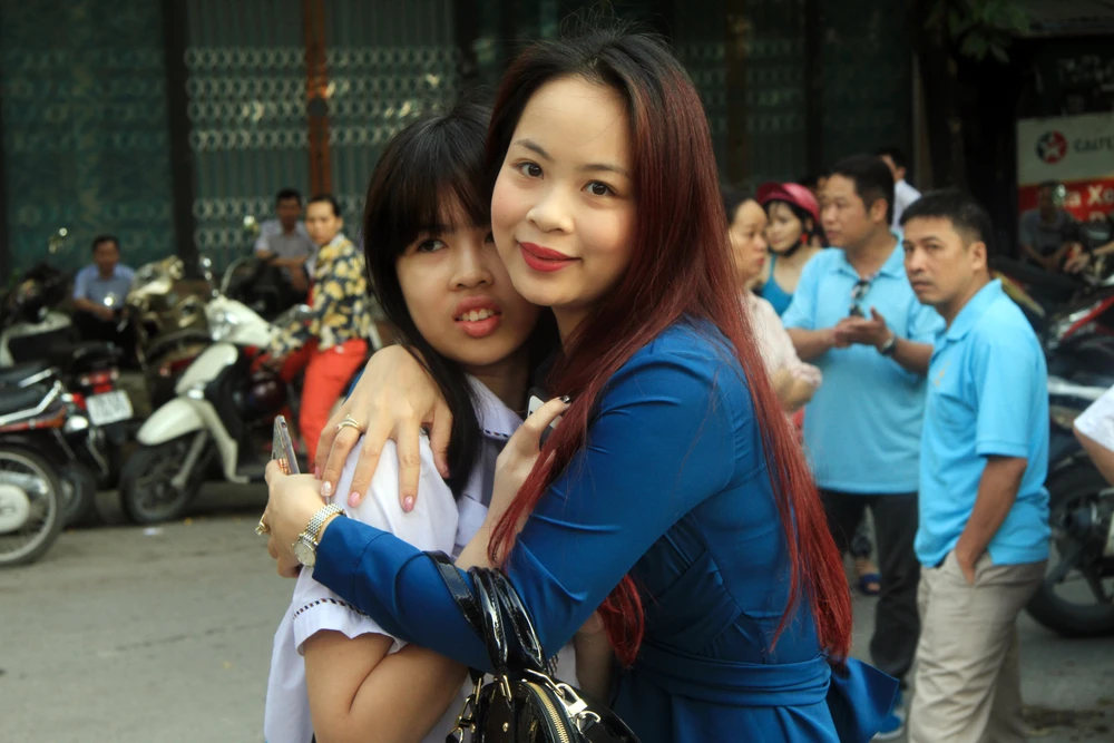 Một phụ huynh ôm con vào lòng để động viên tinh thần con trước khi vào phòng thi.