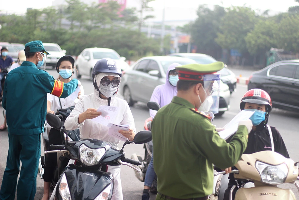 Tại chốt kiểm tra lối lên cầu Vĩnh Tuy, từ phía quận Long Biên, có người còn cầm theo cả giấy xác nhận tiêm vaccine, có người đưa cả giấy đường cũ và mới để trình khi được kiểm tra.