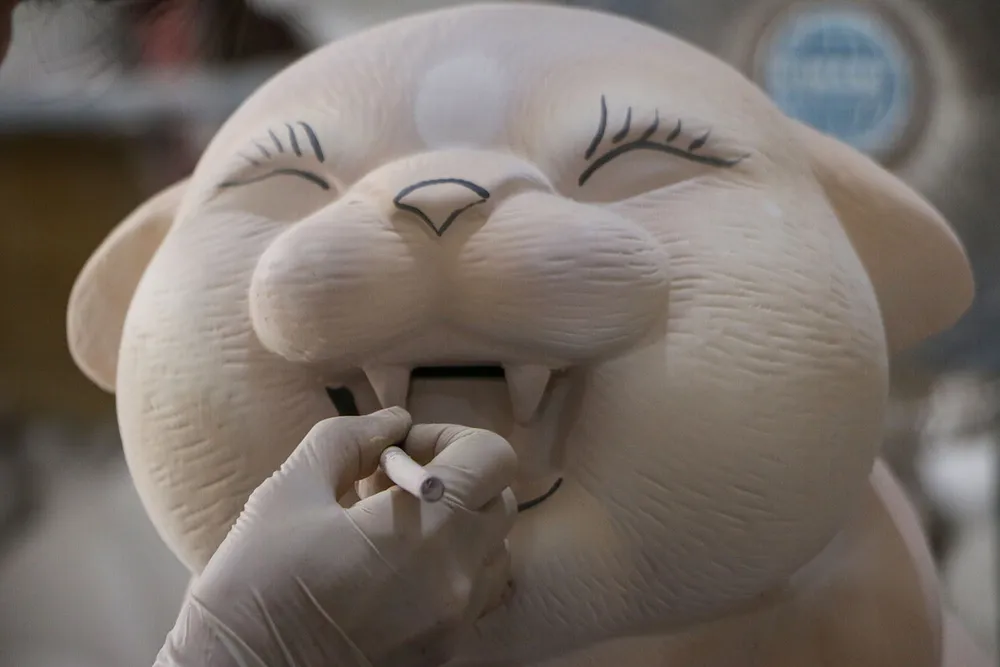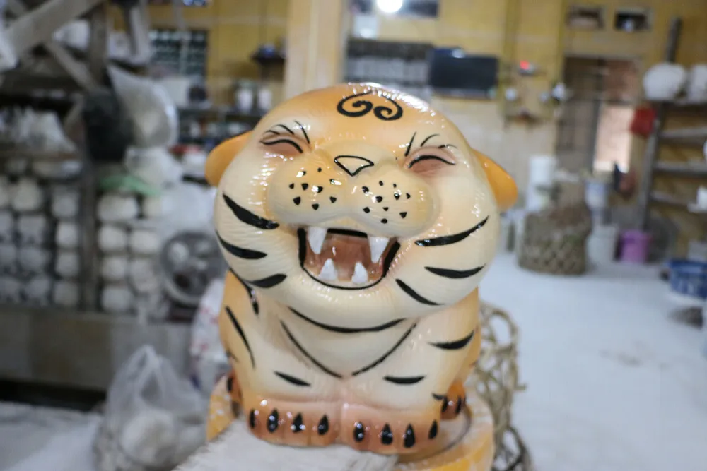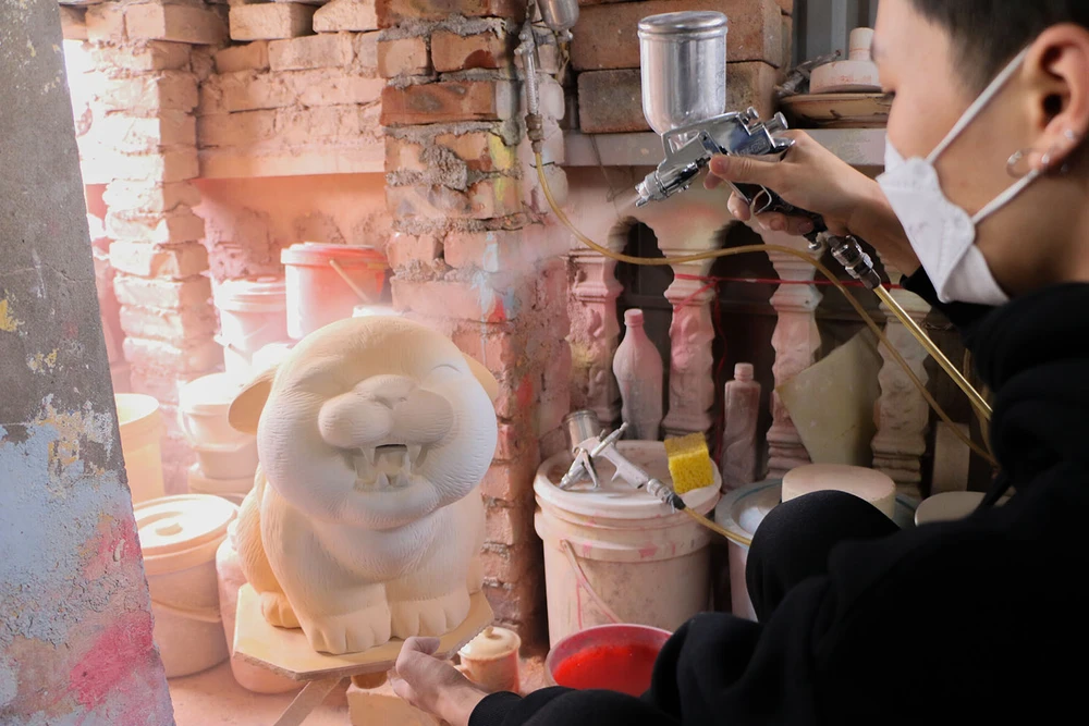 Sau khi phun sơn, sản phẩm được chuyển sang bộ phận vẽ các đường nét. Người làm còn phải kẻ vẽ những đường nét, tô hoa văn… để hổ được nhìn đẹp nhất. Sau quy trình vẽ, các con vật sẽ được đưa vào lò gốm để nung ở nhiệt độ từ 1200 - 1500 độ C.