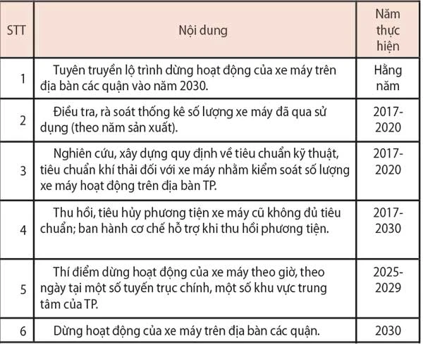 | Lộ trình thực hiện sáu nhóm giải pháp hạn chế xe cá nhân được chia thành ba giai đoạn. Giai đoạn 2017-2018: Tập trung thực hiện các giải pháp về quản lý phương tiện tham gia giao thông và tăng cường công tác quản lý nhà nước về giao thông vận tải. Giai đoạn 2017-2020: Tập trung thực hiện các giải pháp về quản lý số lượng, chất lượng phương tiện tham gia giao thông và phát triển vận tải hành khách công cộng. Giai đoạn 2017-2030: Triển khai đồng thời, đồng bộ các nhóm giải pháp về đầu tư, xây dựng kết cấu hạ tầng, phát triển vận tải hành khách công cộng... |