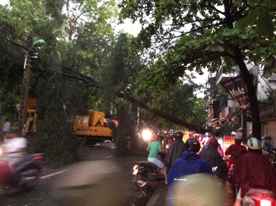 Nhiều nơi cây cối gãy đổ như khu Thanh Nhàn, Nguyễn Phong Sắc, Khâm Thiên...