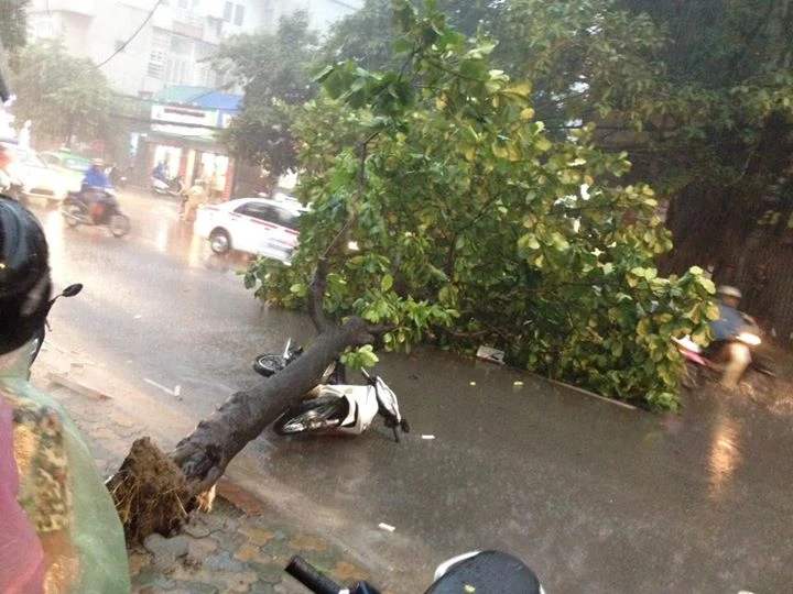 Tại phố khâm thiên, giông lốc làm một cây bàng bật gốc đè ngang một chiếc xe máy của người đi đường đứng trú mưa, rất may không có thiệt hại về người.