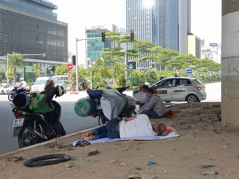 Một số người dừng xe dưới gầm cầu vượt nghỉ ngơi vì sợ sốc nhiệt sau một chặng đường dài lái xe dưới nắng nóng.