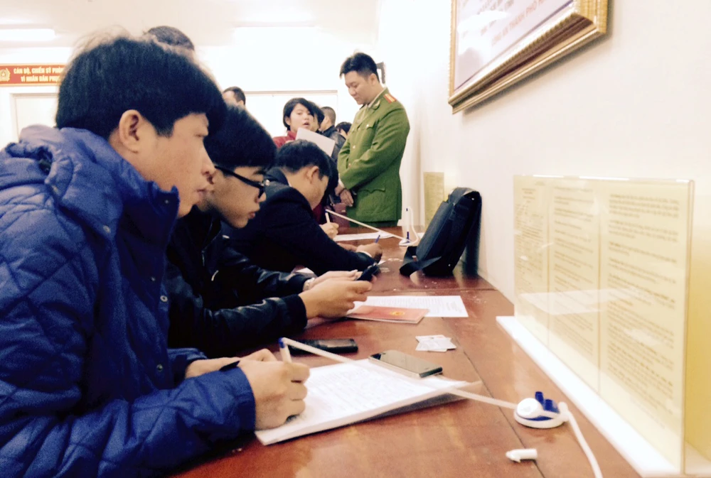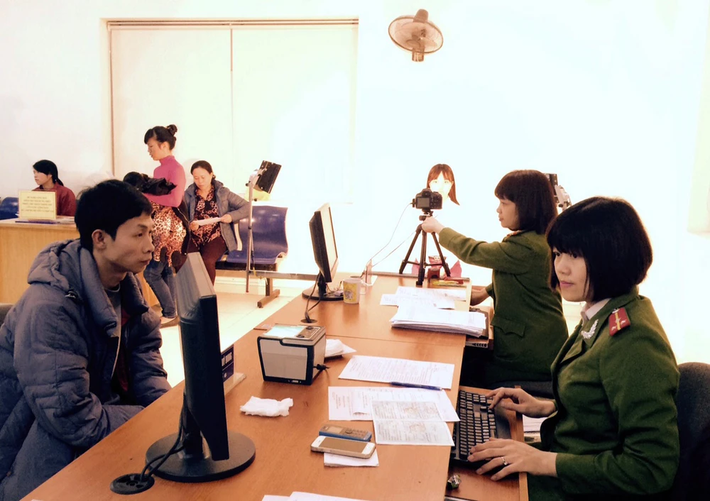 Người dân khai hồ sơ và chụp ảnh thẻ để làm căn cước công dân tại PC64, Công an TP Hà Nội.