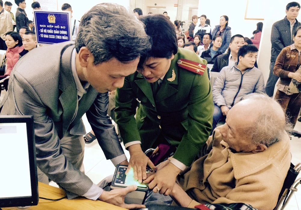Cán bộ bộ phận cấp căn cước công dân PC64 hướng dẫn người dân lấy dấu vân tay tự động bằng máy quét kỹ thuật số.