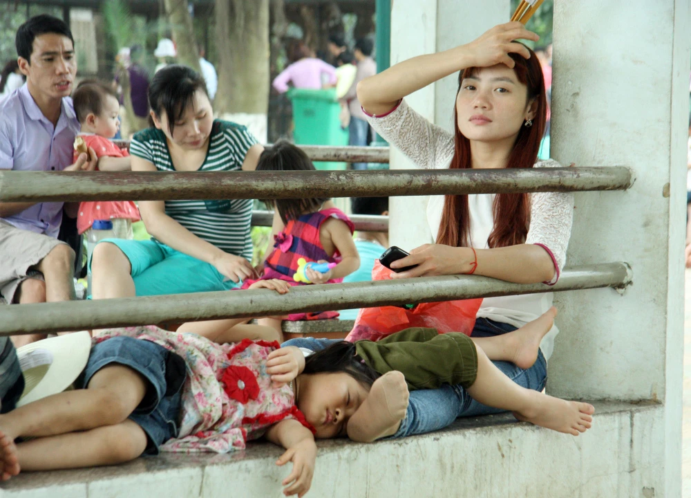 Khi trưa đến, nhiều người tranh thủ cho con mình ăn, ngủ tại công viên.