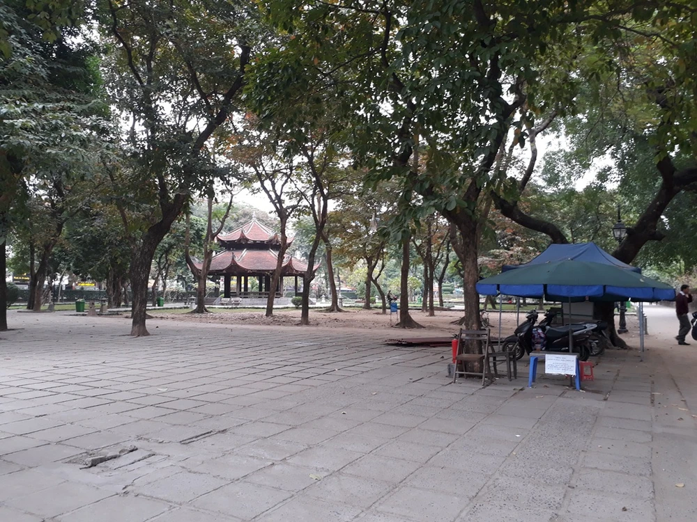 Bãi gửi xe trong vườn Giám thay vì chật kín như mọi ngày thì hiện không còn chiếc nào. Tại đây, chỉ 1-2 nhân viên có nhiệm vụ mới được để xe.