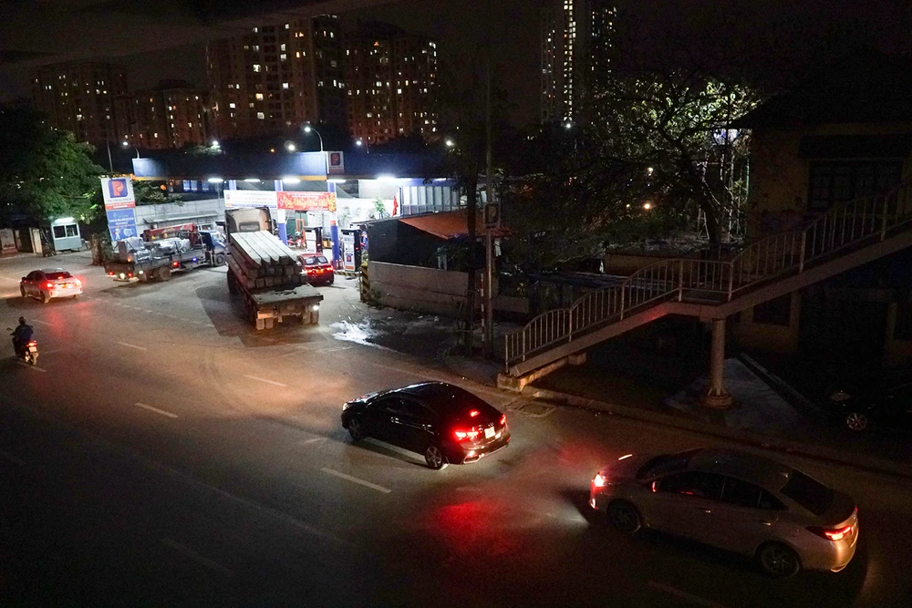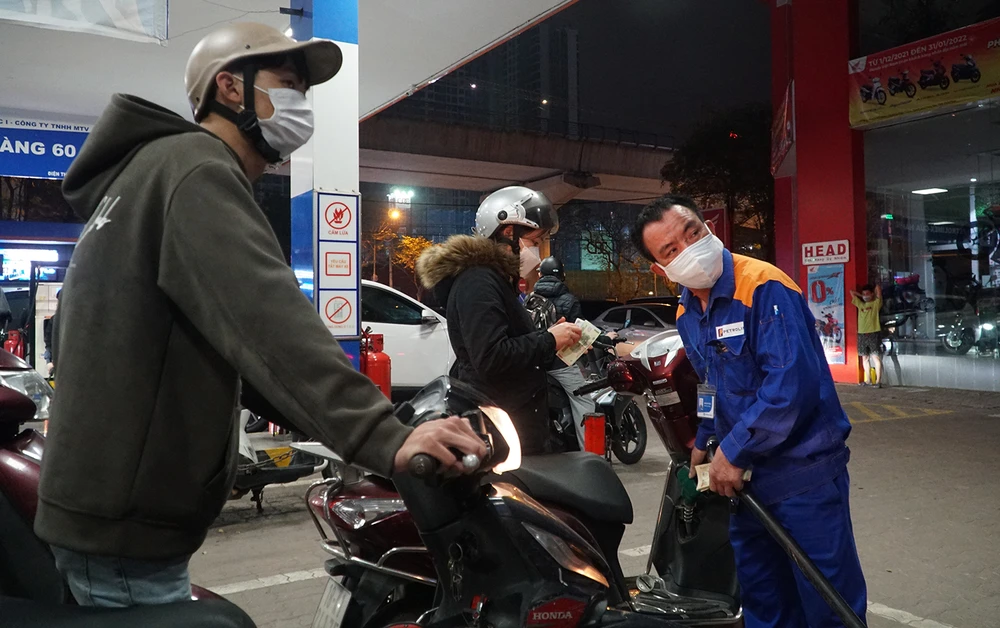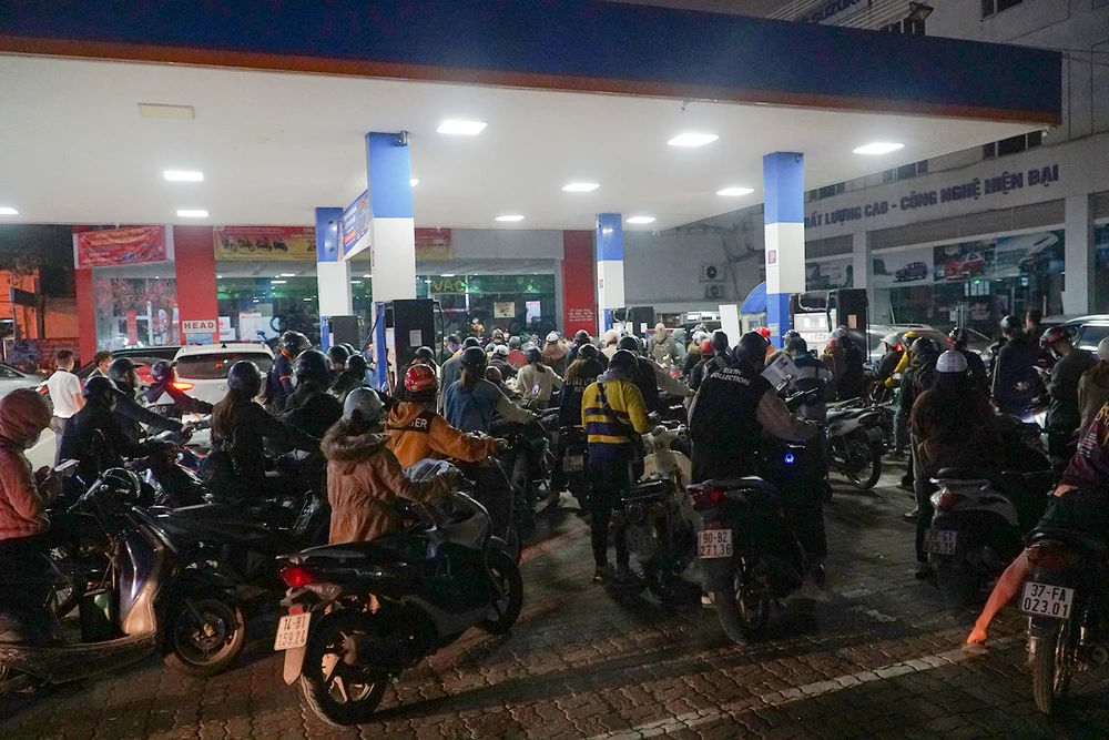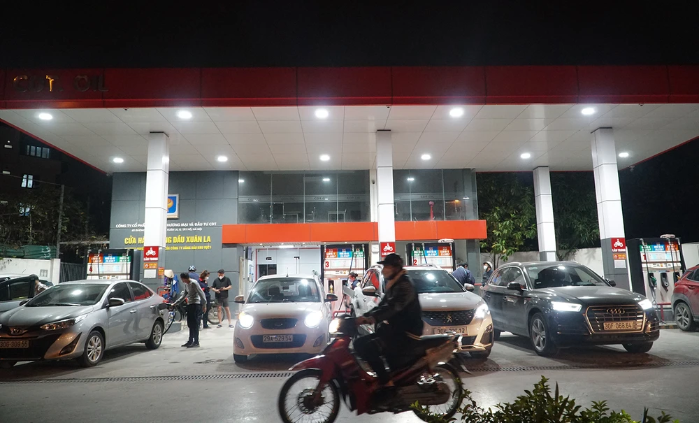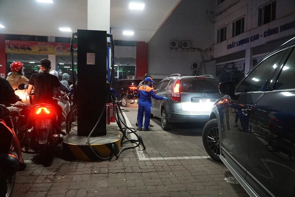 Đến 21 giờ tối cùng ngày, tại một cửa hàng xăng dầu nằm trên đường Xuân Thủy, quận Cầu Giấy, lượng người tới đổ xăng vẫn chưa giảm.
