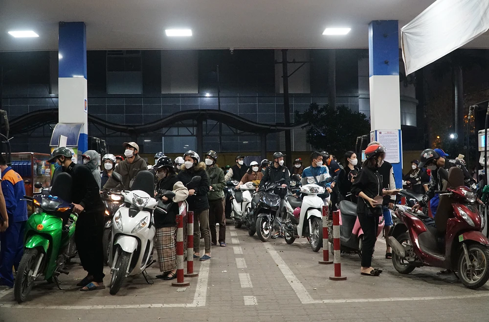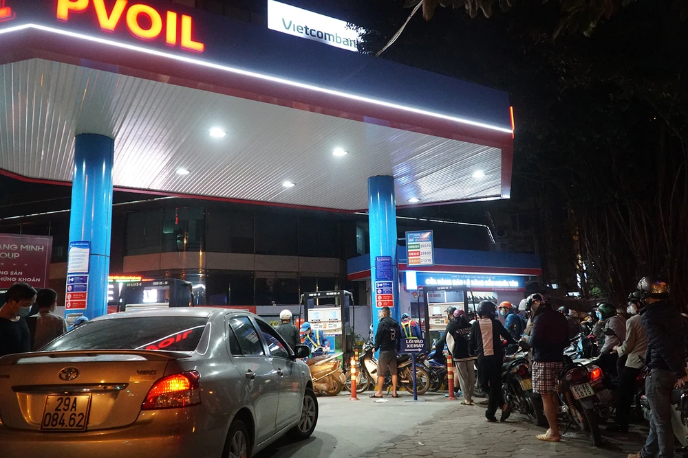 Gần 22 giờ, một cây xăng trên đường Phạm Văn Đồng (Hà Nội), các hàng phương tiện cũng nối đuôi nhau để vào.
