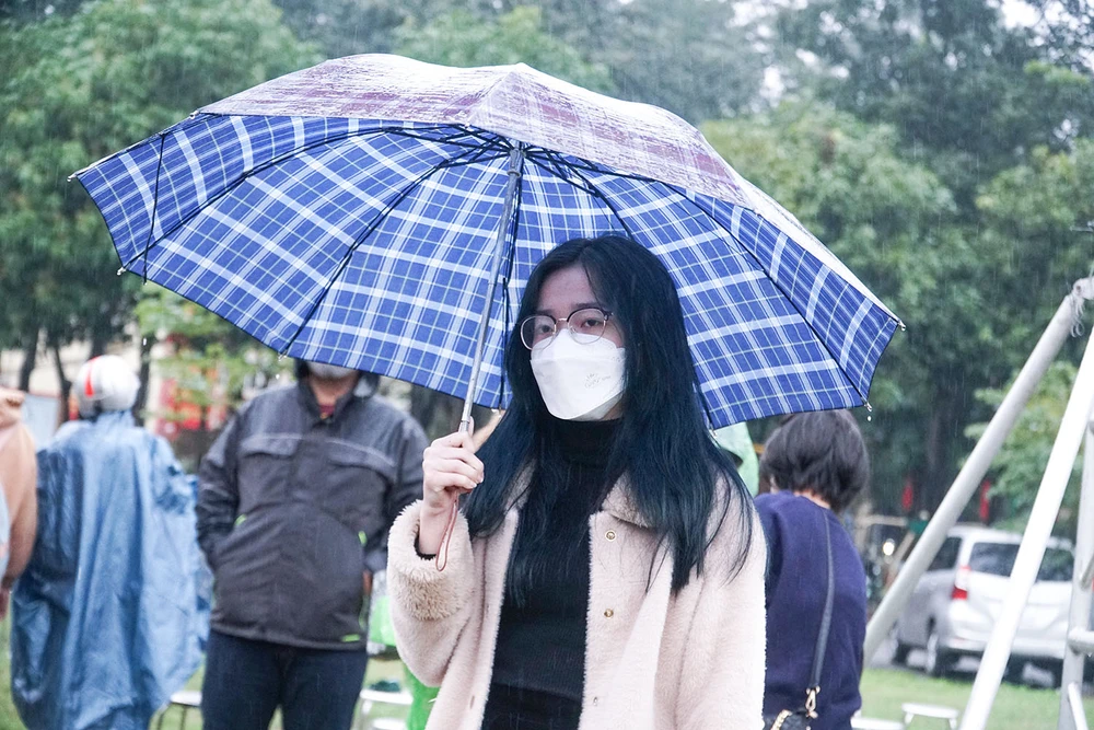 Nhiều người thân của các tân binh đứng dưới trời mưa để chứng kiến và theo dõi buổi lễ.
