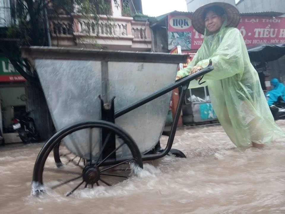 Dù mưa rất to nhưng nhiều chị lao công vẫn cần mẫn với công việc của mình. Ảnh: Phi Hùng