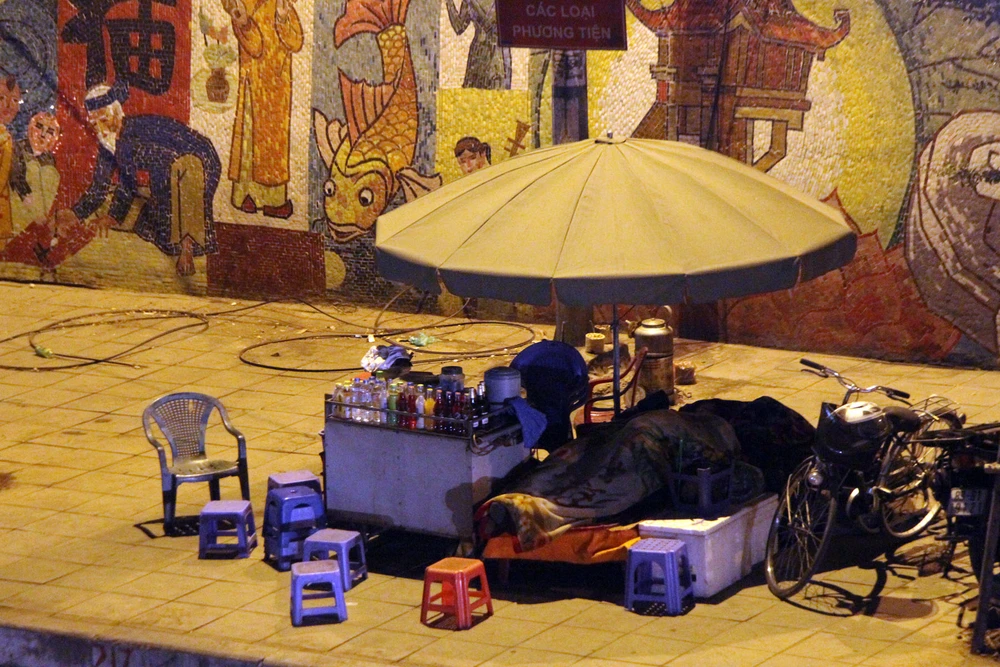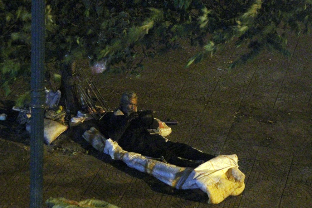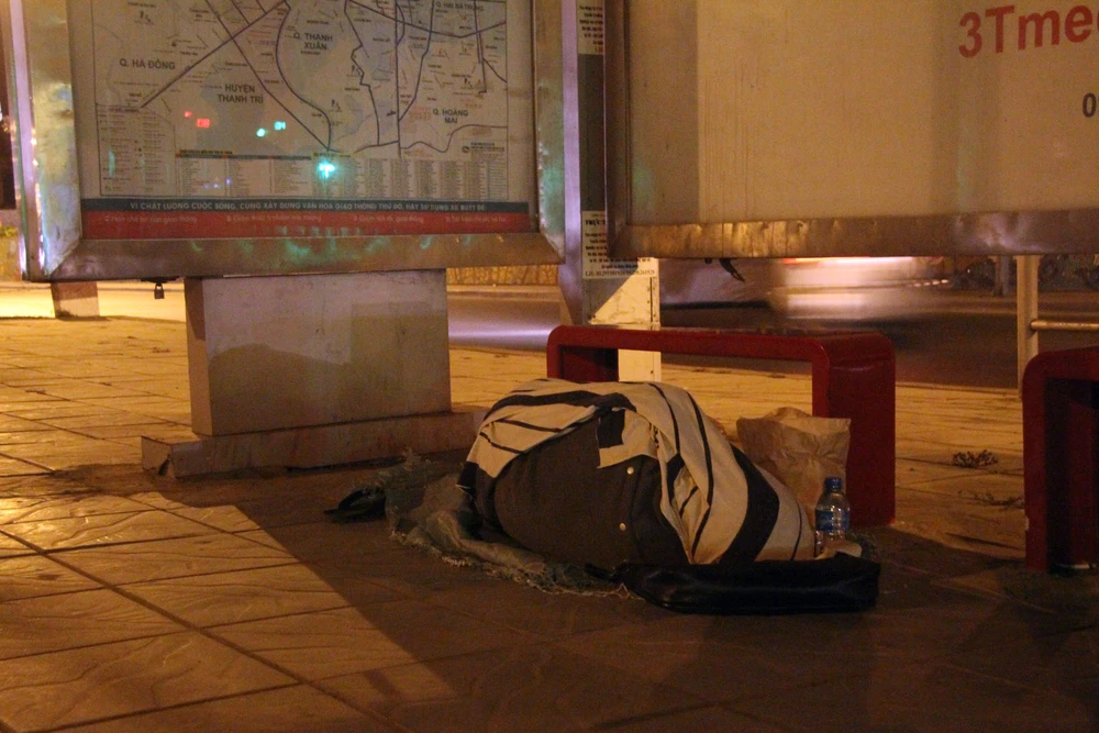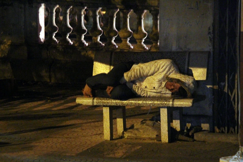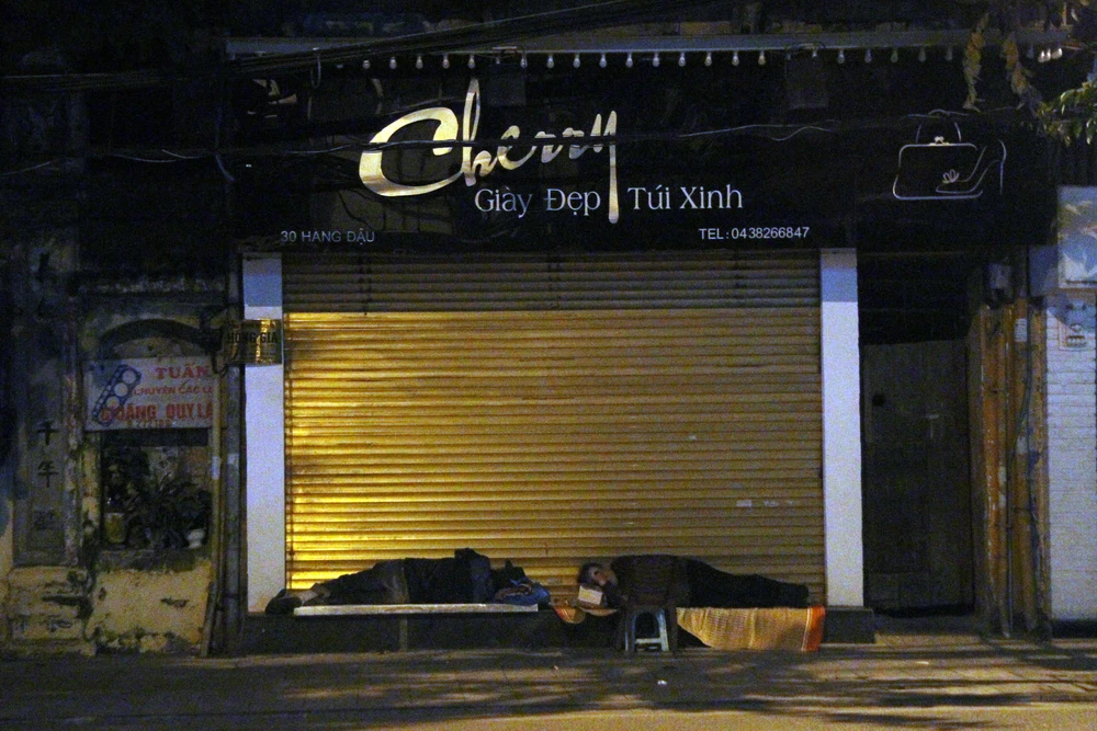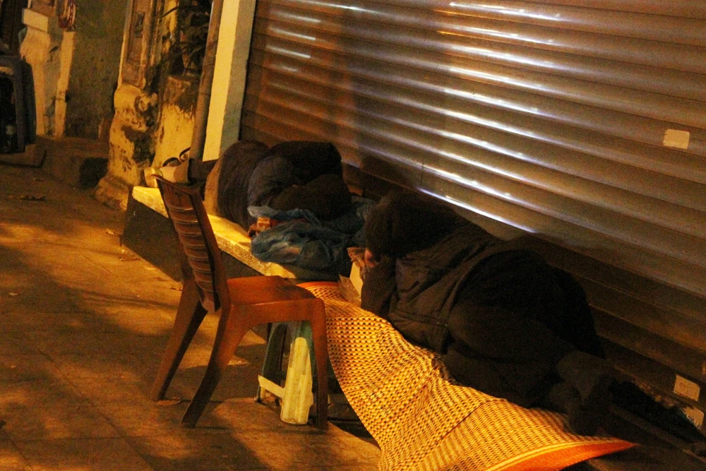 Tại phố Hàng Đậu, hai người vô gia cư nằm tạm trước cửa một cửa hàng...