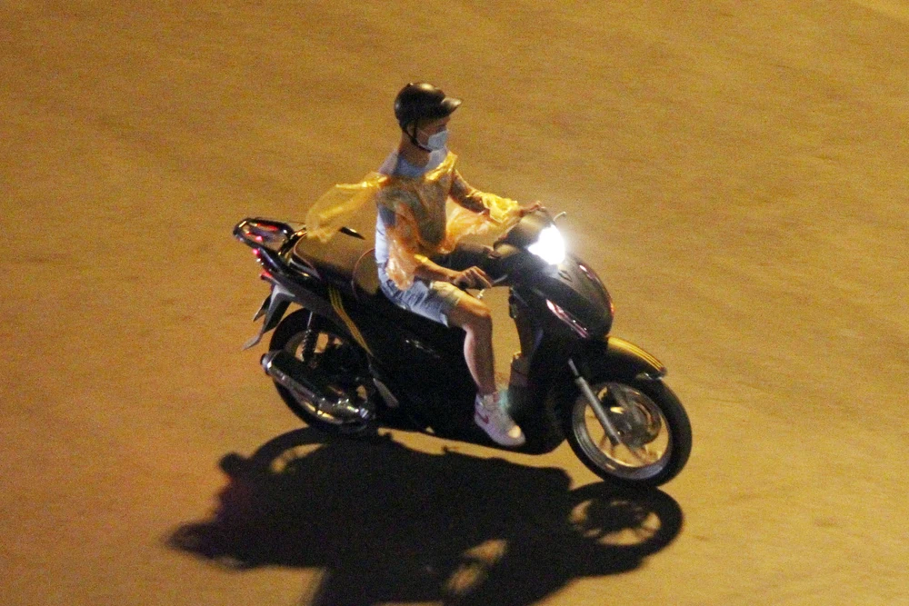 Một thanh niên khác, khoác tạm chiếc áo mưa mỏng lên người để chắn gió.