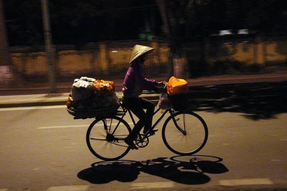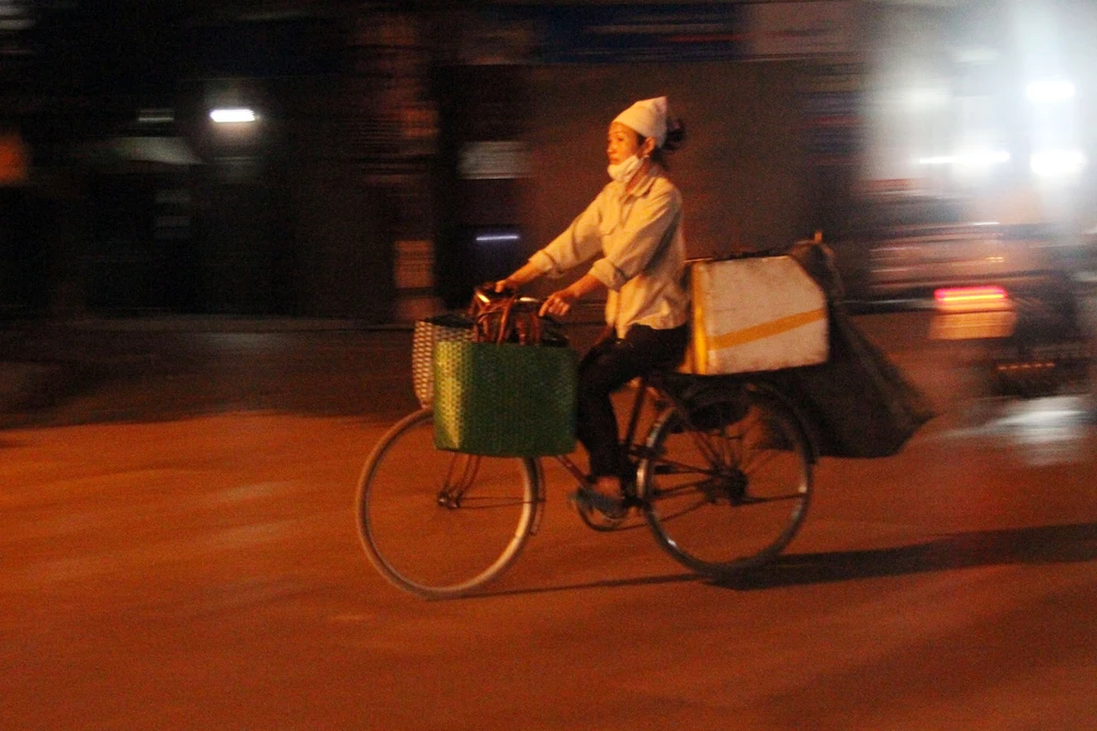 Những người phụ nữ vẫn miệt mài trong đêm để mưu sinh bên chiếc xe đạp.