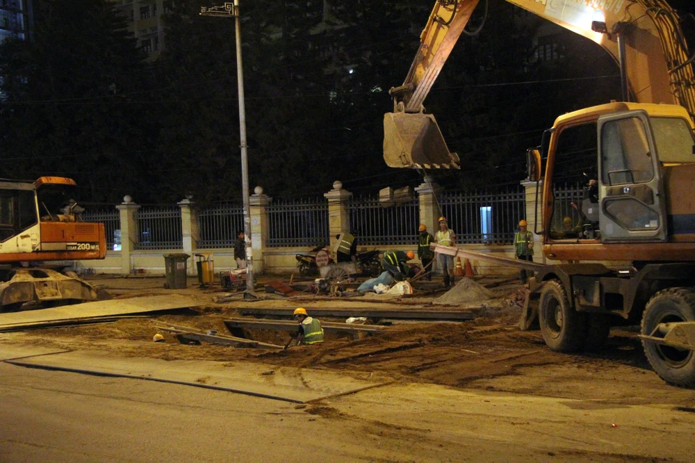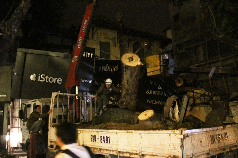 Đêm qua, một cây cổ thụ trên dưới trăm tuổi bị đổ ở đường Đện Biên Phủ, những người công nhân cũng phải vất vả làm việc cả đêm để để kịp giải phóng mặt bằng.