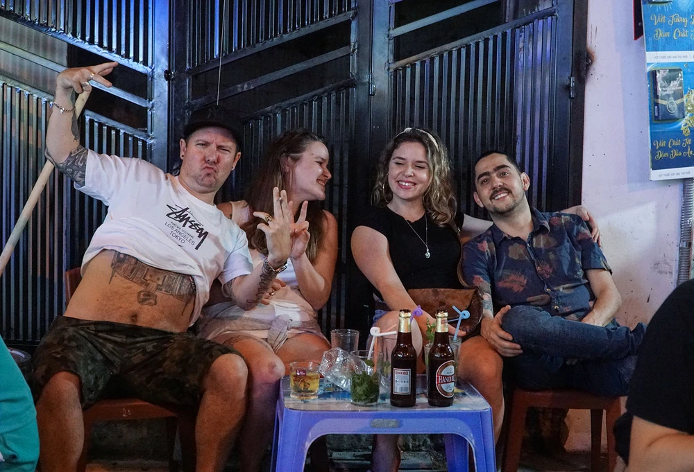 Mở cửa trở lại không gian đi bộ Hà Nội cũng là một giải pháp phục hồi ngành du lịch Thủ đô vốn chịu nhiều tổn thất sau hơn hai năm bùng phát chủng virus lạ bắt nguồn từ Vũ Hán, Trung Quốc, đầu 2020. Trong ảnh là nhóm bạn trẻ nước ngoài, rất có thể thuộc diện kẹt lại Việt Nam vì dịch, và đã thích ứng linh hoạt.
