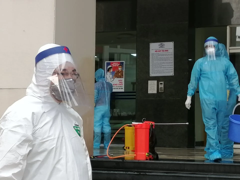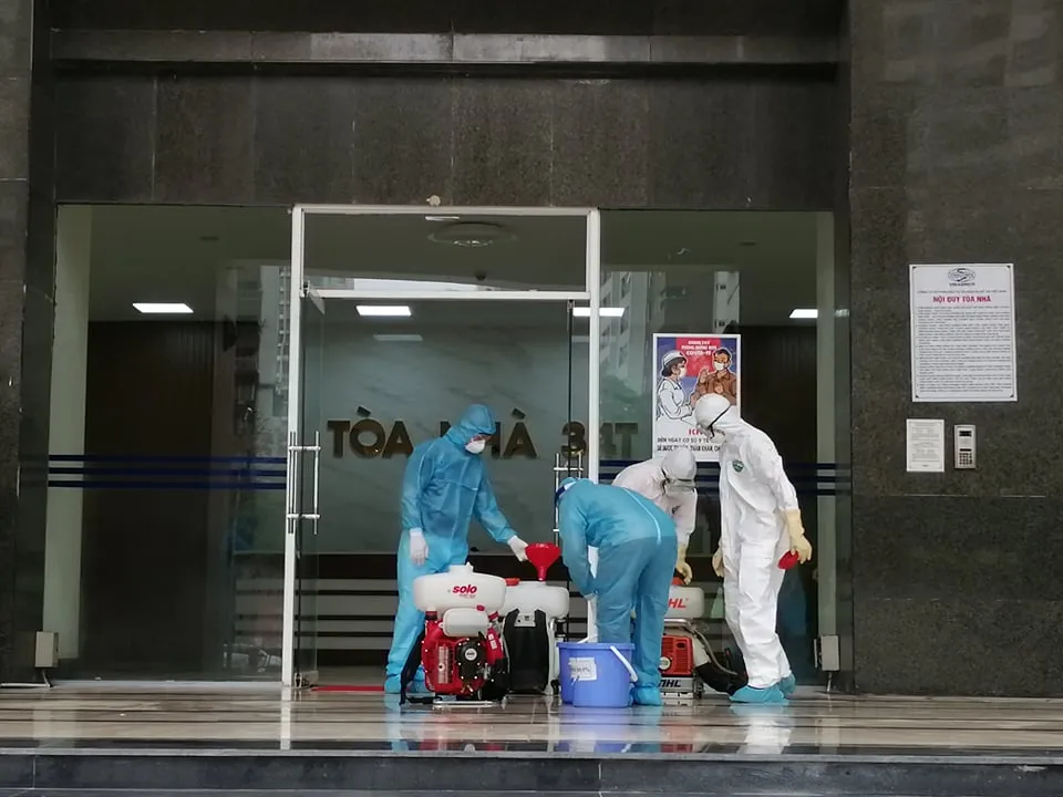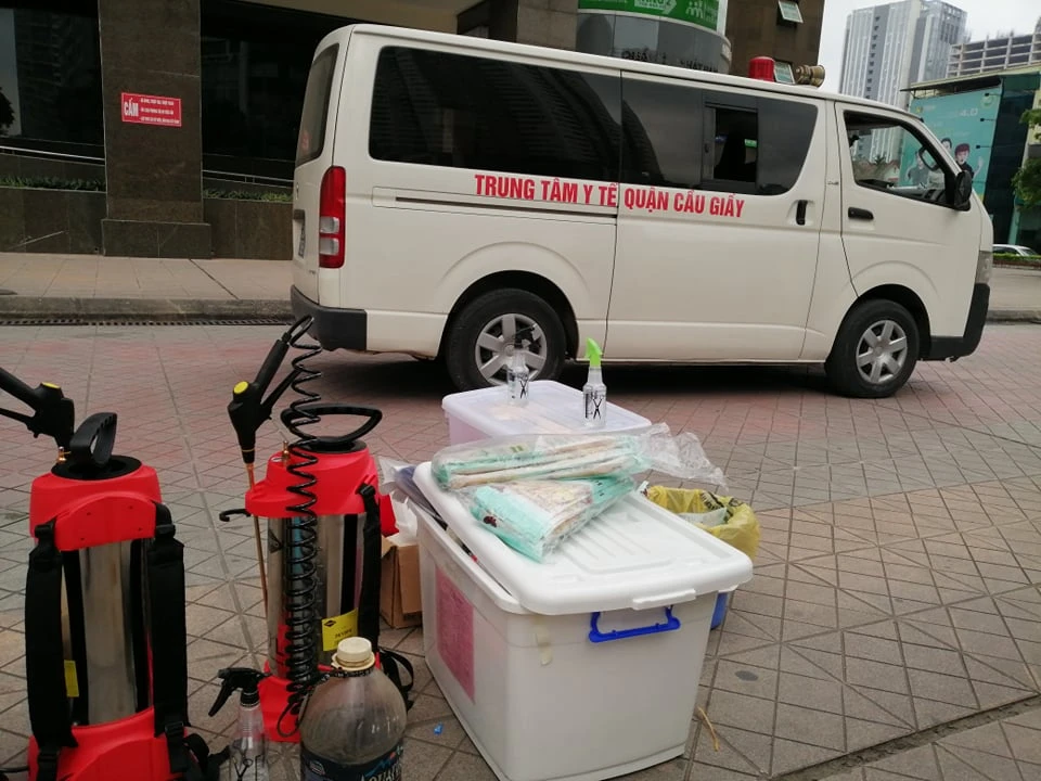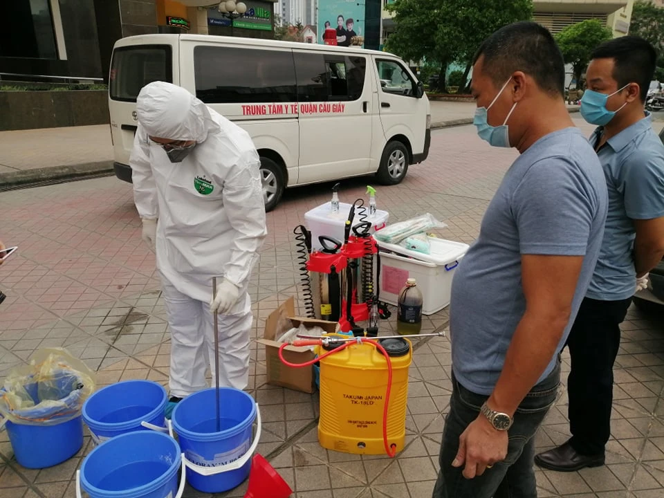Dung dịch khử khuẩn được các nhân viên của Trung tâm Y tế quận Cầu Giấy di chuyển tới tòa nhà. Ảnh: TP