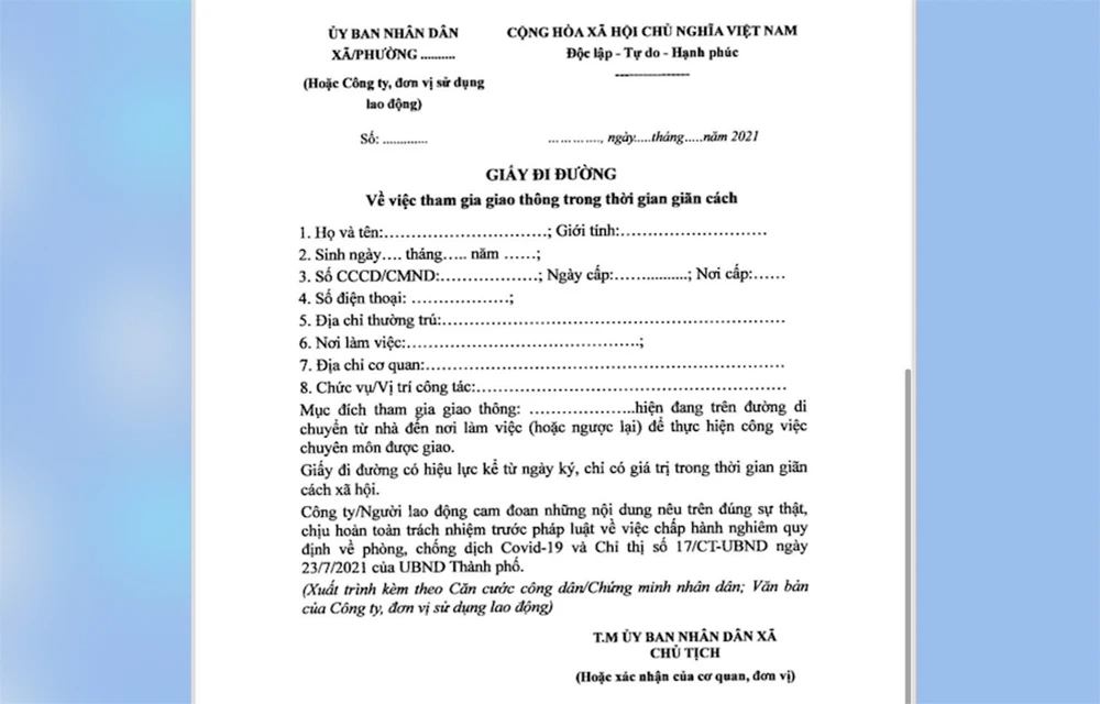 Thống nhất mẫu giấy tờ, quy trình kiểm soát việc di chuyển của lực lượng công vụ, y tế, công nhân, lao động hiện đang sinh sống tại khu vực ven đô, rút ngắn thời gian khai báo để di chuyển vào thành phố, UBND TP quy định cụ thể về về việc cấp, sử dụng Giấy đi đường như sau: