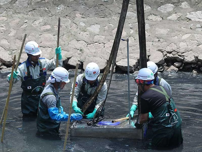 Các chuyên gia Nhật Bản đang xử lý ô nhiễm sông Tô Lịch bằng công nghệ Bio-nano. Ảnh: TR.PHÚ