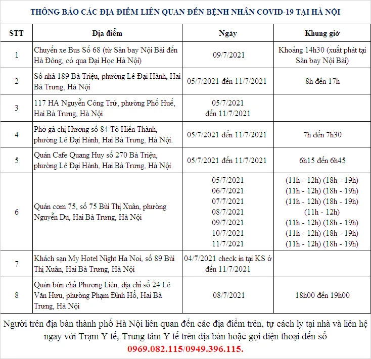 CDC Hà Nội khuyến cáo người trên địa bàn thành phố Hà Nội liên quan đến các địa điểm trên cần tự cách ly tại nhà và liên hệ ngay với trạm y tế, Trung tâm y tế trên địa bàn hoặc gọi điện thoại đến đường dây nóng phòng chống dịch: 0969.082.115 – 0949.396.115.