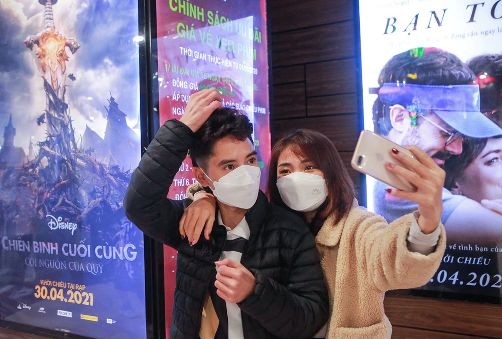Nhiều bạn trẻ tranh thủ chụp những bức ảnh lưu niệm sau nhiều tháng mới được quay trở lại rạp chiếu phim.