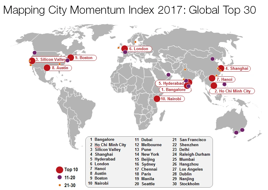 Trong tốp 30 nước lọt vào bảng xếp hạng có TP năng động nhất thế giới năm 2017 thì hơn một nửa là các nước ở châu Á-Thái Bình Dương. Trong đó, TP Bangalore, trung tâm công nghệ của Ấn Độ, giành vị trí quán quân và đất nước Nam Á này là đất nước đứng thứ sáu trong số 30 quốc gia thay da đổi thịt nhanh nhất trên thế giới. Việt Nam có TP.HCM và TP Hà Nội lần lượt xếp ở vị trí thứ hai và thứ tám trong bảng xếp hạng.