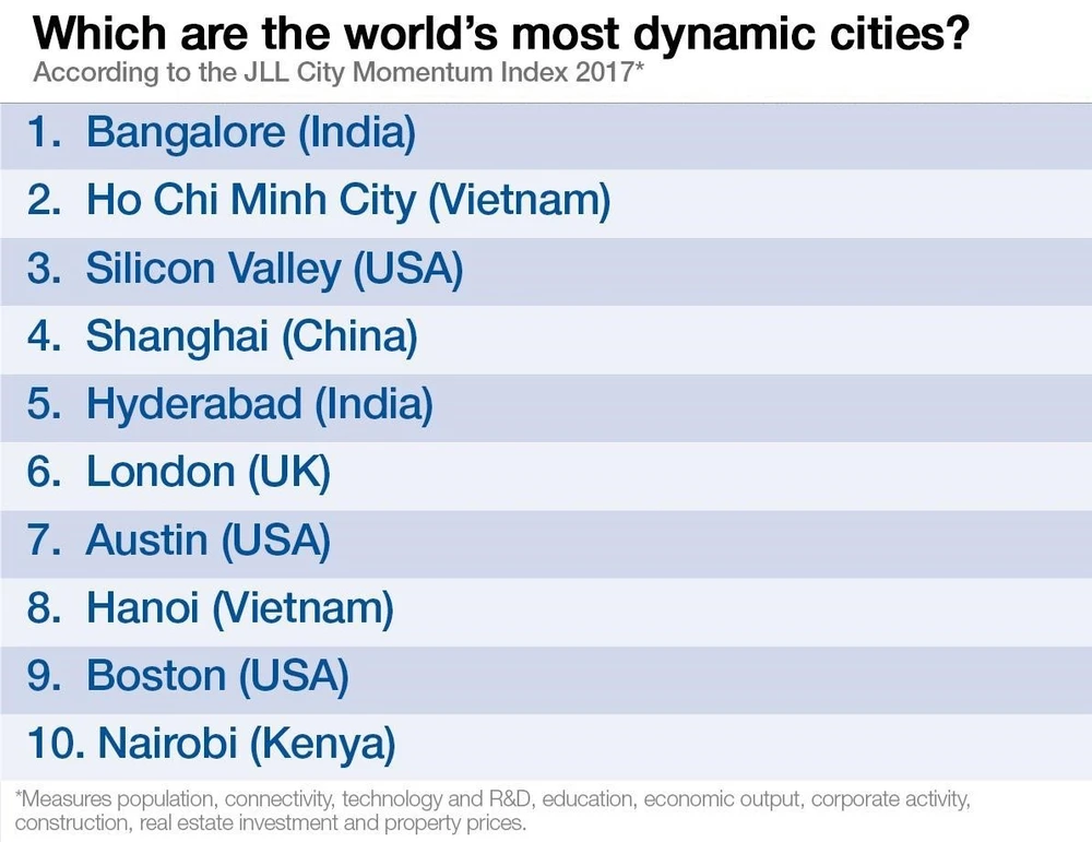Việt Nam có hai TP lọt tốp 10 bảng xếp hạng TP năng động thế giới là TP.HCM (đứng thứ hai) và Hà Nội (đứng thứ tám). Hai TP này được đánh giá là những “TP tiềm năng cao”, tiếp tục thu hút vốn từ các nhà đầu tư nước ngoài và quá trình chuyển từ sản xuất thu nhập thấp lên một bước tiến mới.