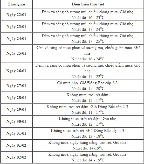 Từ 29-1 đến 2-2, trời không mưa, ngày nắng; đêm và sáng trời rét. Nhiệt độ trong ngày dao động phổ biến 12-20 độ.