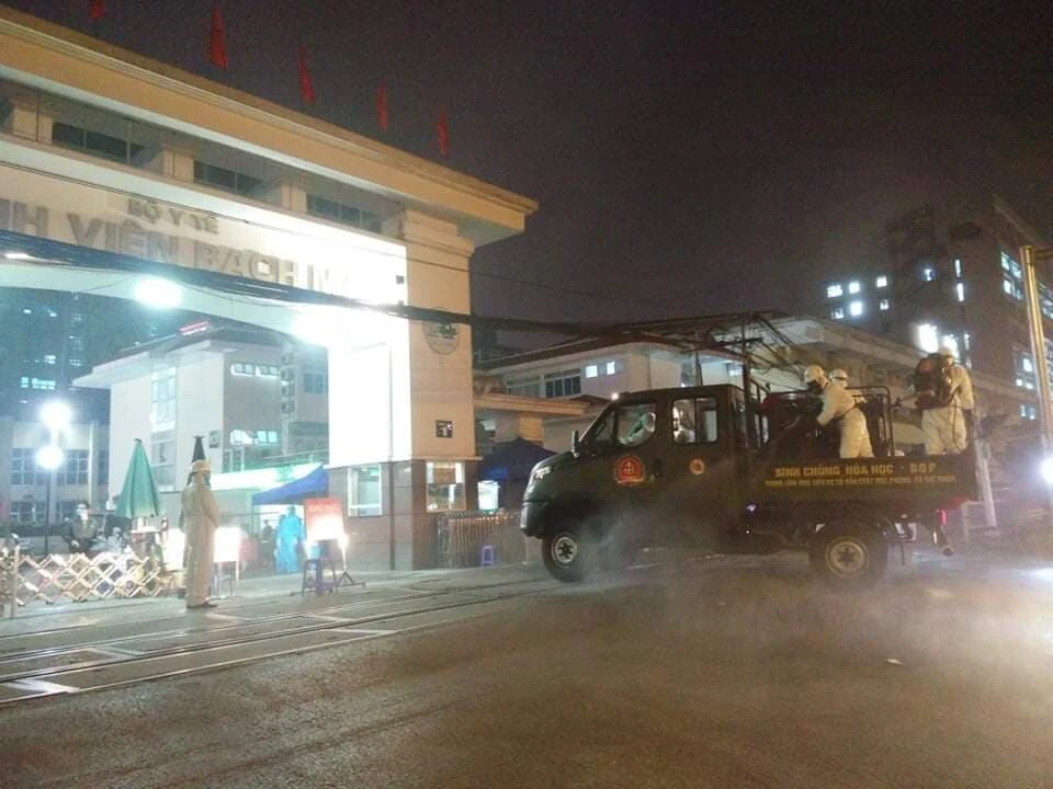 Binh chủng Hóa học phun khử khuẩn tại BV Bạch Mai tối 28-3.