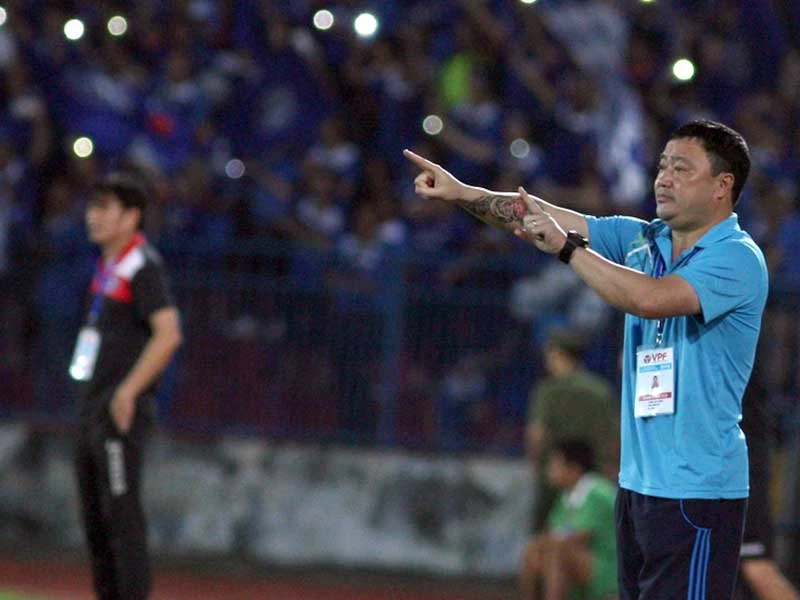 Gonzalo ghi hai bàn thắng giúp Hà Nội T&T vô địch V-League 2016 trong sự bất lực của HLV Trương Việt Hoàng của đội Hải Phòng. Ảnh: QUANG THẮNG