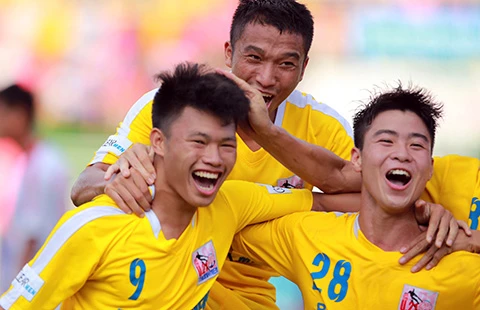 Niềm vui vào chung kết của các cầu thủ U-21 Hà Nội T&T. Số 9 là Phạm Văn Thành với cú hat trick đưa anh sớm nhận danh hiệu vua phá lưới. Ảnh: XUÂN HUY