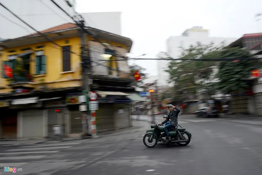 Không chỉ người lớn tuổi, giới trẻ nhiều năm nay cũng có thói quen ra đường khá đông vào sáng mùng 1 Tết. Một đôi bạn trẻ chạy sidecar ngang qua ngã tư Hàng Gai - Lương Văn Can.