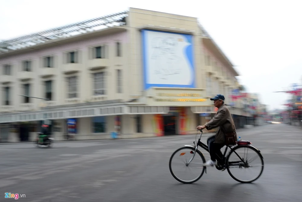 6h sáng ngày mùng 1 Tết, nhiều tuyến phố trung tâm thủ đô vắng vẻ, nhiều người còn say giấc nồng sau đêm đón giao thừa. Trong ảnh là phố Trần Quý Cáp lúc 6h30, các cửa hàng đóng, nghỉ kinh doanh.