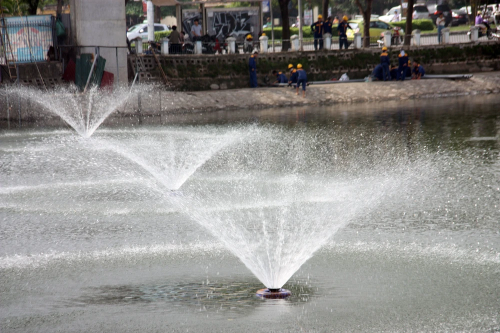 Công ty TNHH MTV Môi trường Đô thị Hà Nội đưa máy xục tạo ôxy từ khu xử lý rác thải Nam Sơn về hồ Hoàng Cầu.