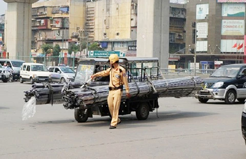 Một xe ba gác tại ngã tư Khuất Duy Tiến - Nguyễn Trãi, quận Thanh Xuân (Hà Nội) bị CSGT kiểm tra, xử phạt. Ảnh: NĐ