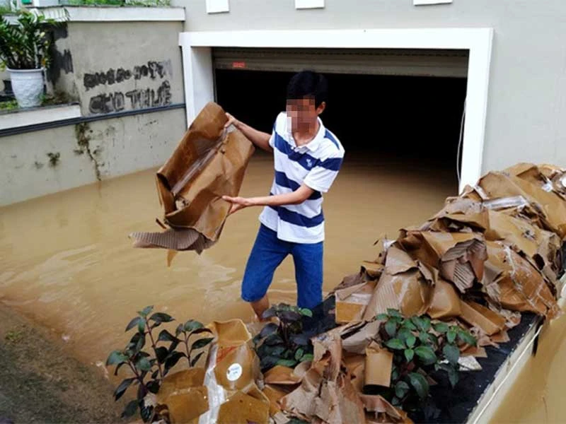 Toàn bộ tầng hầm của căn nhà bị ngập nước. Đường trước cửa cũng ngập, có chỗ nước cao tới ba tấc. Mỗi lần xe chạy qua, nước dâng lên tràn vào tầng hầm.