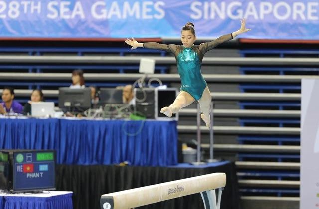 Hà Thanh thi nội dung cầu thăng bằng. Ảnh: QUANG LIÊM