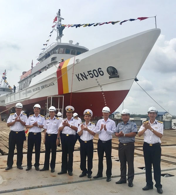 Lãnh đạo Cục Kiểm ngư và Nhà máy X51 tại lễ hạ thủy hai tàu Kkểm ngư KN-506 và KN-508. Ảnh: VĂN DƯỠNG