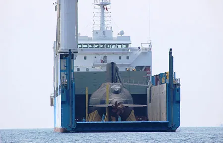 Tàu vận chuyển Rolldock Star chở tàu ngầm Kilo 183 TP.HCM mở cửa hậu để bơm nước hạ thủy sáng 20-3. Ảnh: X.PHƯƠNG