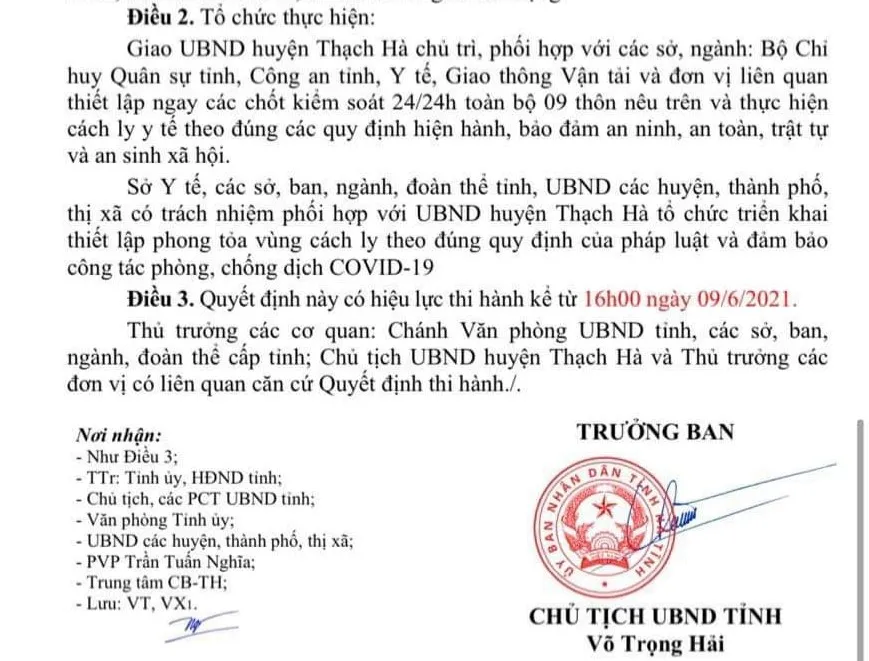 Chiều 9-6, ông Võ Trọng Hải, Chủ tịch UBND tỉnh, Trưởng Ban chỉ đạo phòng, chống dịch COVID-19 tỉnh Hà Tĩnh đã ký quyết định về việc thiết lập vùng cách ly y tế chín thôn của xã Tân Lâm Hương (huyện Thạch Hà, Hà Tĩnh) để phòng, chống COVID-19.