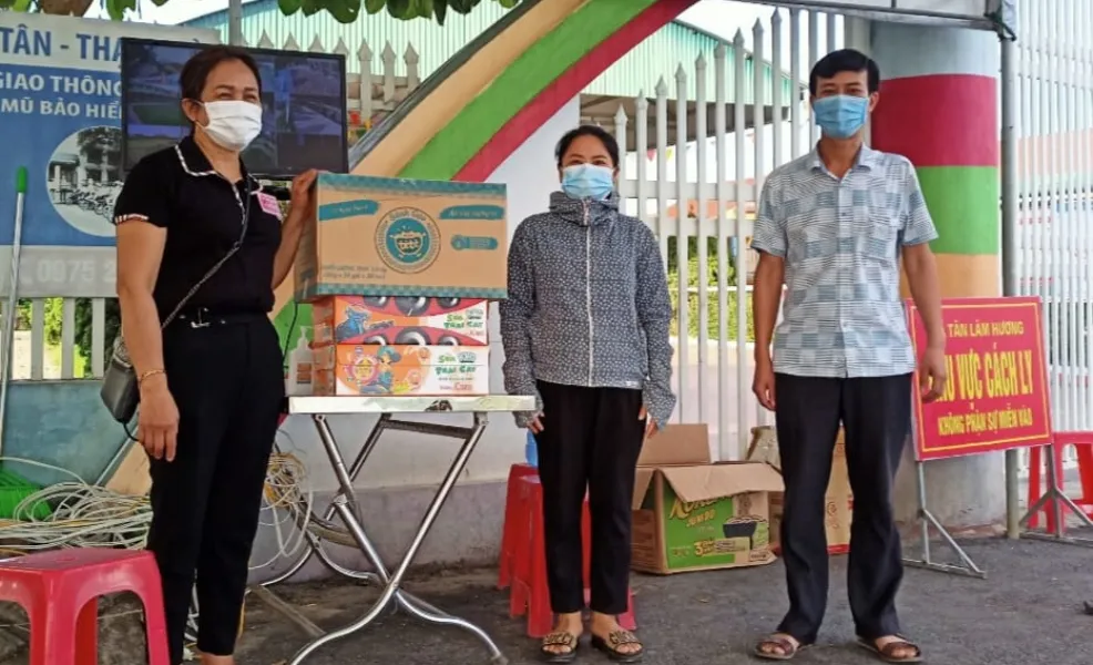 Đại diện Ban giám hiệu và Công đoàn Trường THCS Nguyễn Hoành Từ đến tặng quà cho các em ở các điểm cách ly của xã Tân Lâm Hương.