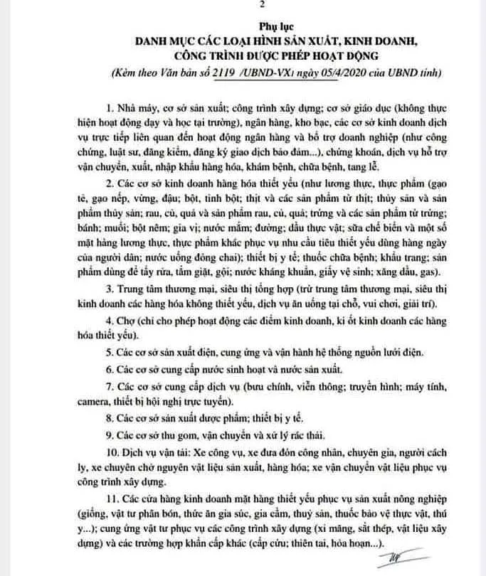 Tạm dừng hoạt động các cơ sở kinh doanh hàng hóa, dịch vụ trên địa bàn trừ các cơ sở kinh doanh hàng hóa, dịch vụ thiết yếu theo chỉ đạo của Thủ tướng Chính phủ tại Chỉ thị số 15/CT-TTg ngày 27-3-2020, Chỉ thị số 16/CT-TTg ngày 31-3-2020 và Văn bản số 2601/VPCP-KGVX ngày 3-4-2020. Các hàng hóa không có trong danh mục tại phụ lục kèm theo phải tạm dừng hoạt động đến hết ngày 15-4-2020.