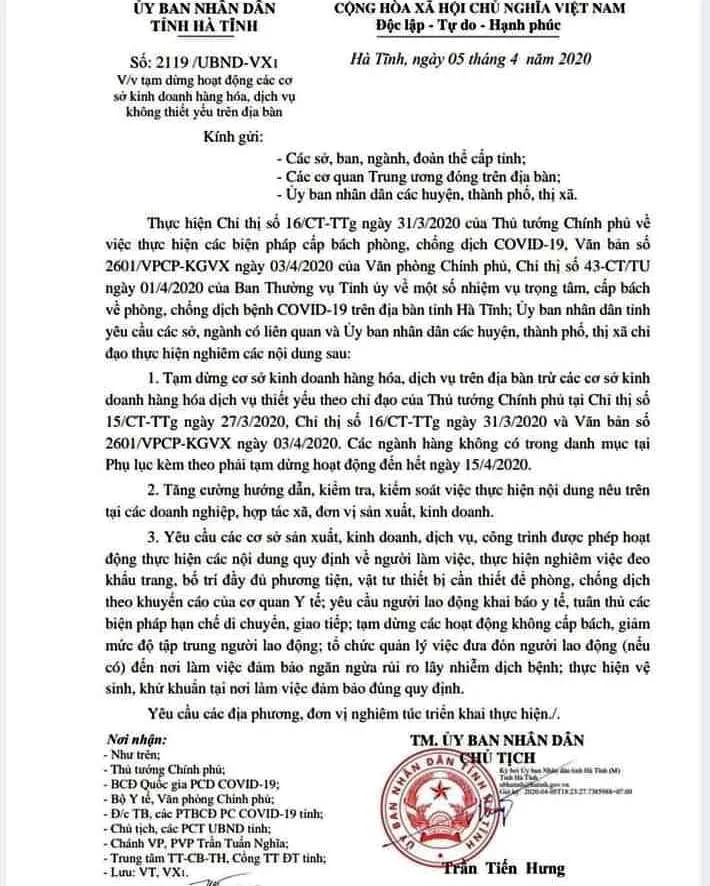 Ngày 5-4, Chủ tịch UBND tỉnh Hà Tĩnh Trần Tiến Hưng ký Công văn 2119 về việc tạm dừng hoạt động các cơ sở kinh doanh hàng hóa, dịch vụ không thiết yếu trên địa bàn.