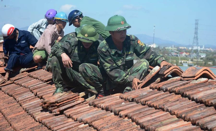 Lực lượng vũ trang đang giúp dân ở Hà Tĩnh lợp lái mái nhà bị bão số 10 làm tốc mái.